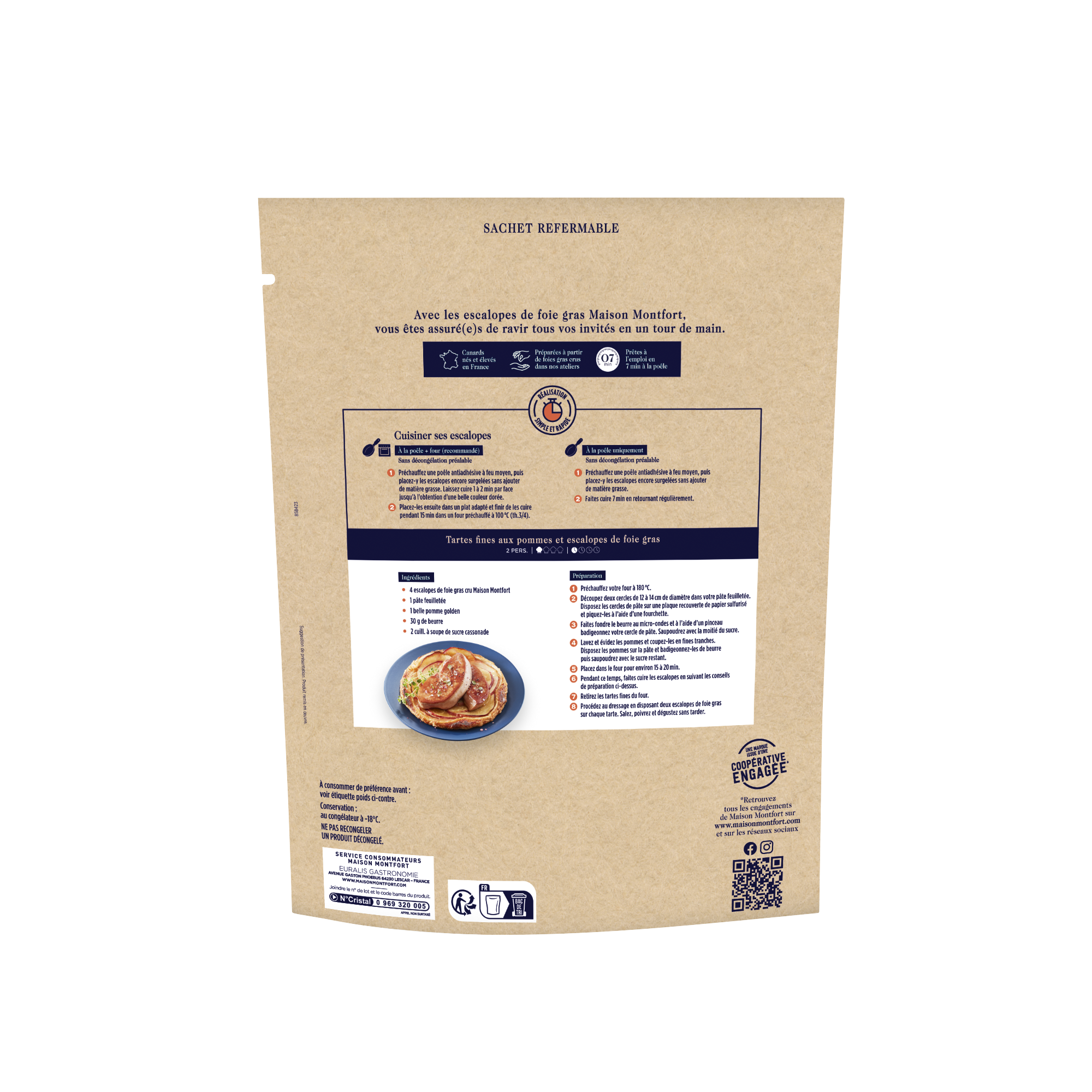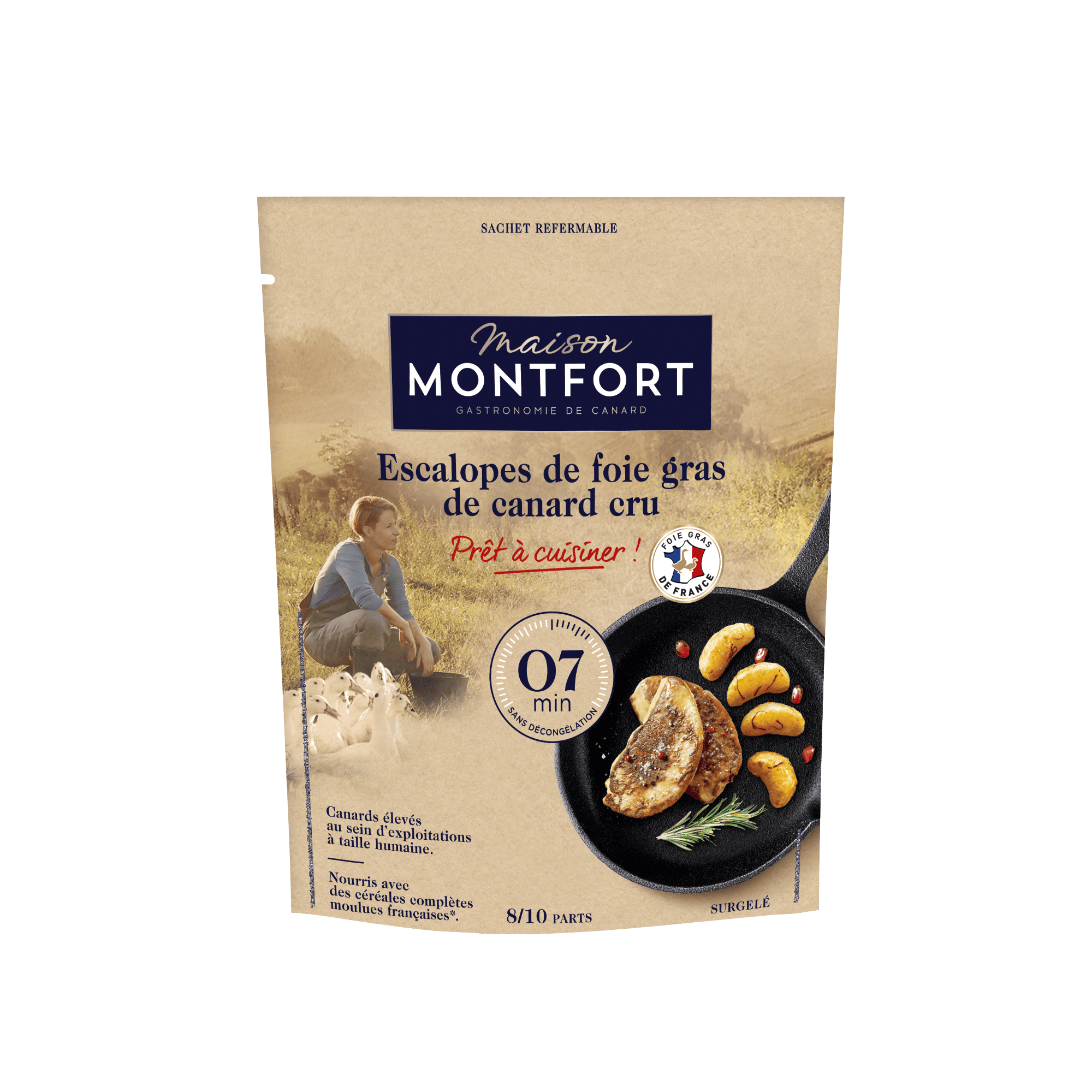 Ces escalopes de foie gras de canard sont élaborées avec des foies d’origine française, préparés puis contrôlés à la main. Grâce au procédé de surgélation Maison Montfort, elles conservent toute leur fraîcheur, avec une fonte limitée à la cuisson. En outre, elles sont toujours à disposition dans votre congélateur et se préparent en 7 min à la poêle sans décongélation !