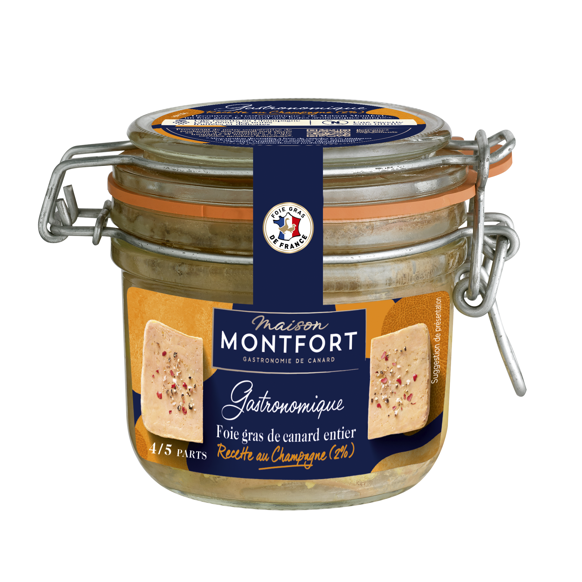 Foie gras de canard (origine France), Champagne 2%, sel, poivres, sucre, gingembre, cardamome