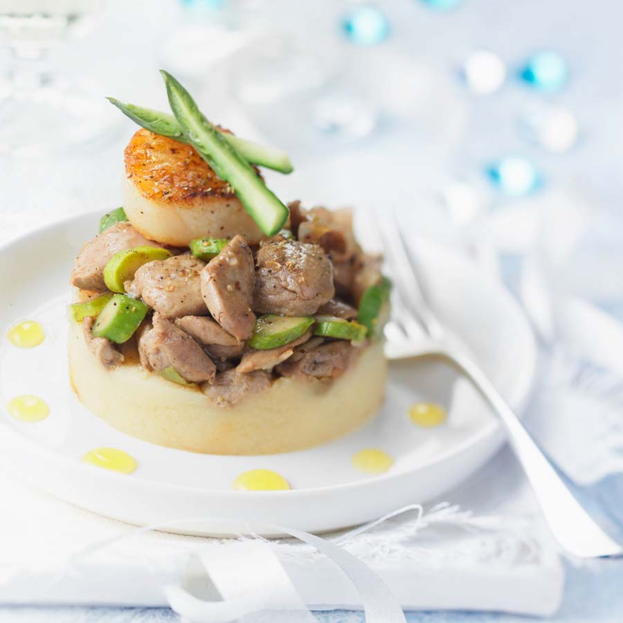 5.  Recouvrez avec la fricassée d’aiguillettes et d’asperges. Terminez par une noix de St Jacques. Ajustez l’assaisonnement avec un peu de fleur de sel et un tour de poivre du moulin.