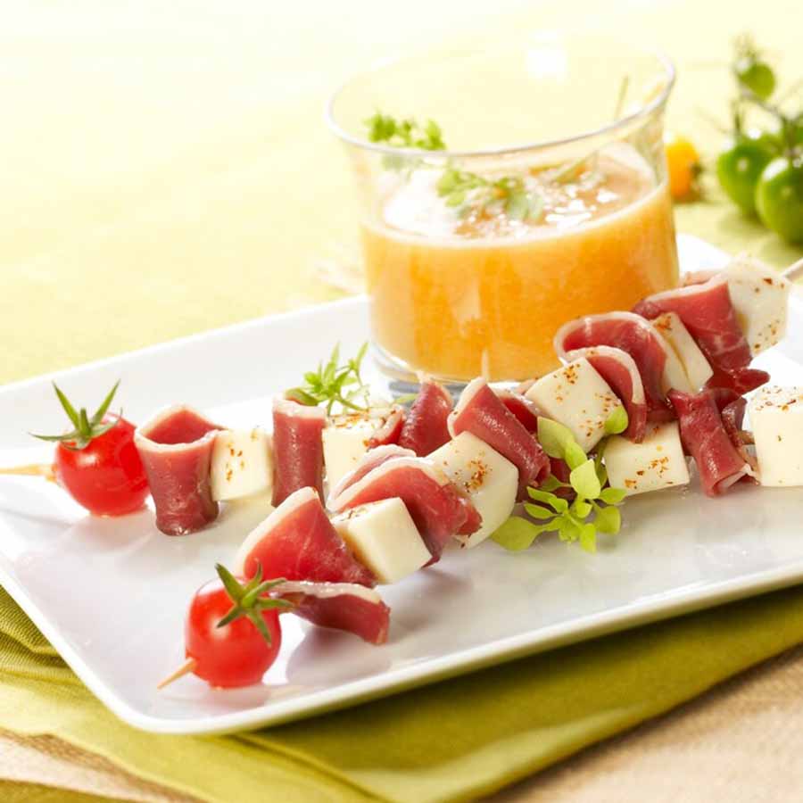 Présenter le gaspacho en début de repas avec deux brochettes par personne. Découvrez nos différentes créations sur notre compte Instagram ou dans nos recettes !