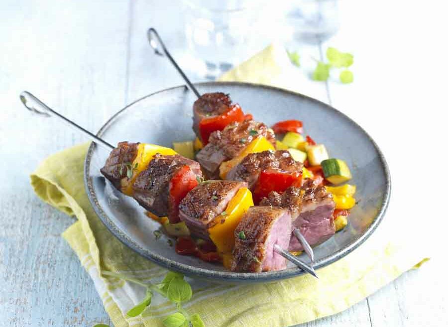 4.  Si vous aimez la viande rosée ou bien cuite, prolongez la cuisson de 2 à 4 minutes de chaque côté. Après quoi, salez et poivrez les brochettes et servez-les accompagnées de la poêlée de légumes du soleil.