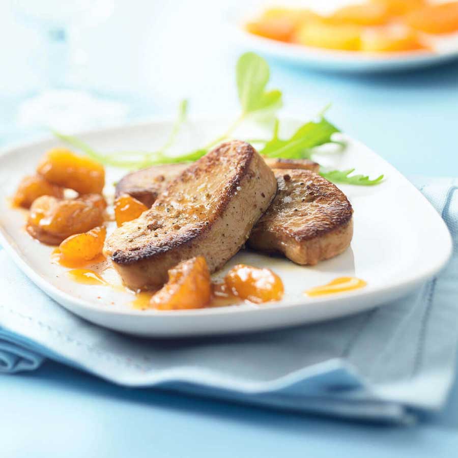 • 4.  Une fois vos escalopes de foie gras saisies, dégraissez la poêle et repositionnez-la sur le feu. Déglacez en y versant l’Armagnac* et les abricots puis faites flamber.