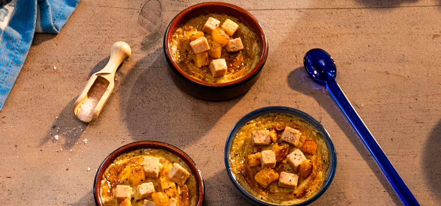 3.  Découpez votre foie gras Maison Montfort en cubes et mélangez-les à la préparation. Gardez-en quelques-uns pour décorer.