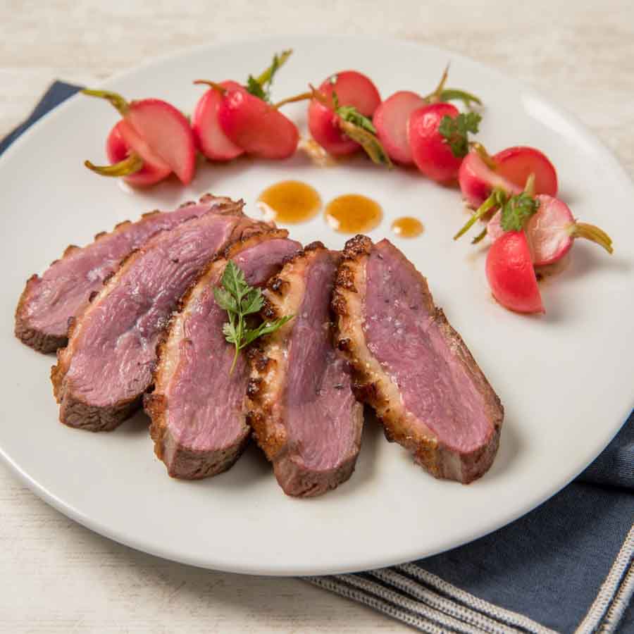 6.  Déglacez avec le vinaigre de cidre puis assaisonnez de sel et de poivre.Coupez les magrets en tranches d’1 cm et servez-les accompagnés des radis.