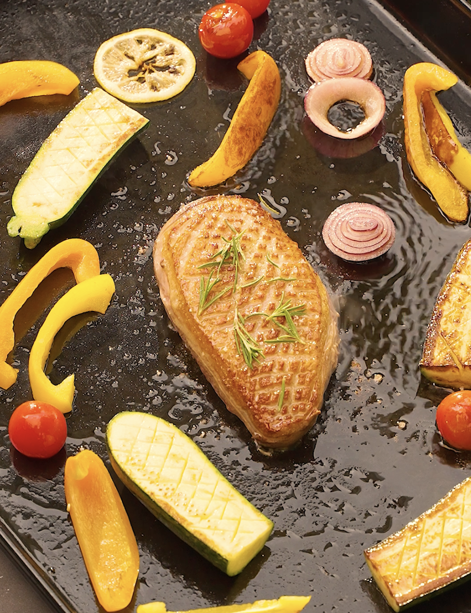 6.  C’est presque terminé ! Servez le magret tranché avec les légumes d'été grillés.