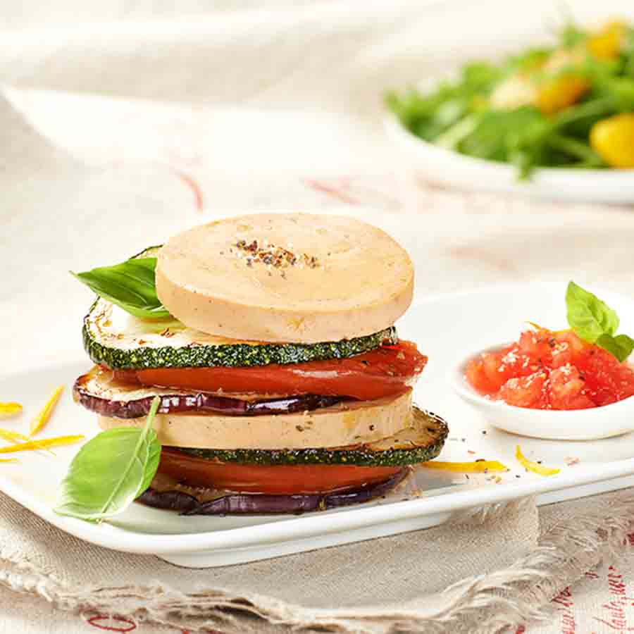 Montage du mille-feuille dans chaque assiette : Monter le mille-feuille en alternant 1 tranche de chaque légume (Aubergine, tomate, courgette) puis le Foie Gras. Répéter deux fois, terminer par les légumes. Couper en 2 le mille-feuille, l’écarter pour l’ouvrir sans séparer totalement les deux moitiés. Dresser un buisson de roquette. Y déposer deux suprêmes d’orange. […]
