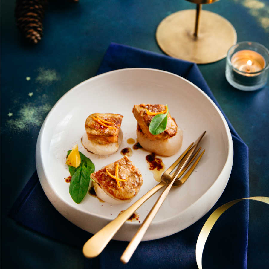 Noix de Saint-Jacques, foie gras poêlé et sauce à l’orange