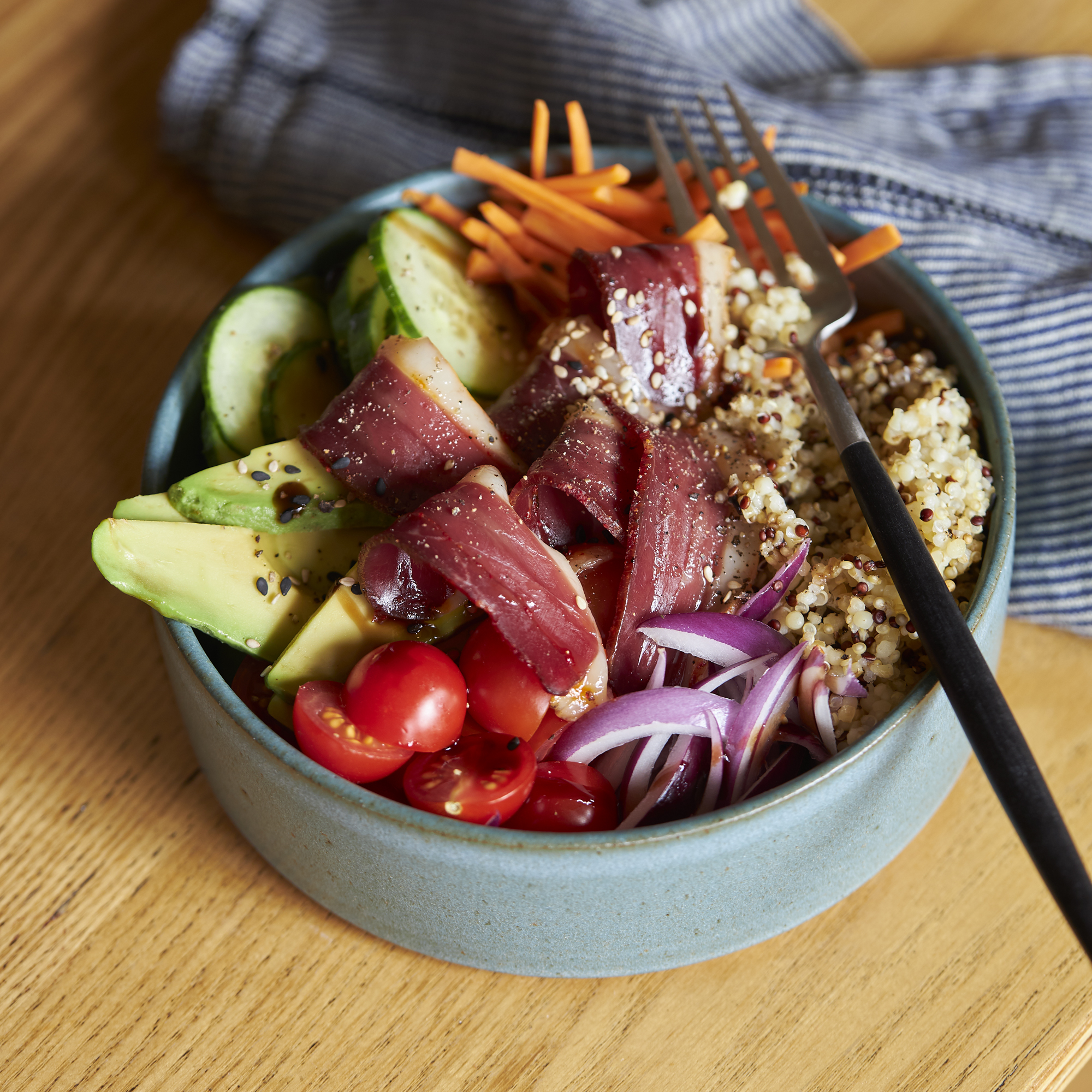 8.  Ajoutez le quinoa, les oignons, les tomates, le magret, l'avocat, le concombre et les carottes.