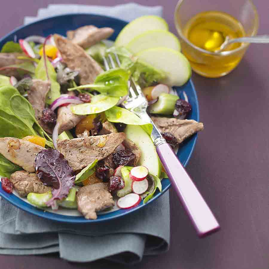 Pour le dressage : Disposez un peu de mesclun sur chaque assiette, répartissez les morceaux d’aiguillettes déglacées au vinaigre de mangue. Ajoutez le céleri, les radis roses, les abricots coupés en 4, l’oignon émincé, les cranberries et les quartiers fins de pomme verte. Dans un bol, mélangez l’huile et le vinaigre de pulpe de mangue, […]
