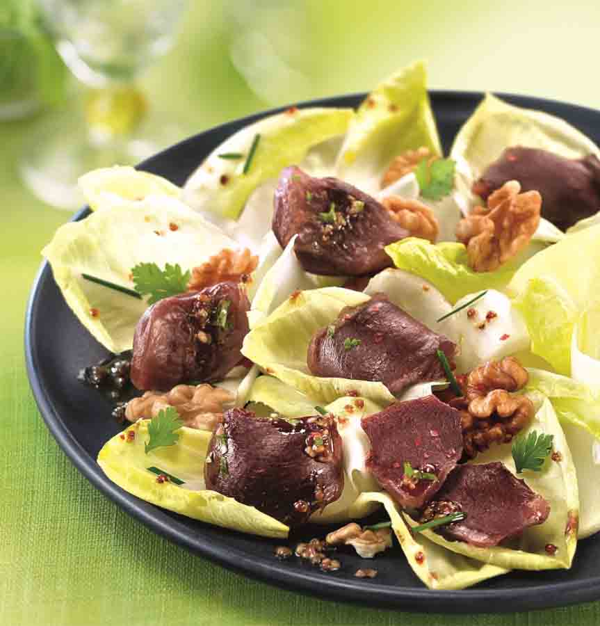 Pour la vinaigrette : 4 cuillères à soupe d’huile d’olive 2 cuillères à soupe de vinaigre de cidre 1 cuillère à café de baies roses écrasées Fleur de sel