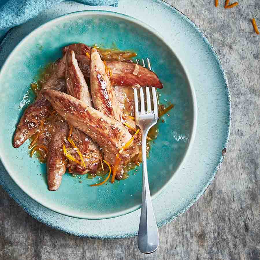 • 1.   2h avant de cuisiner : répartissez équitablement les aiguillettes dans 3 assiettes.