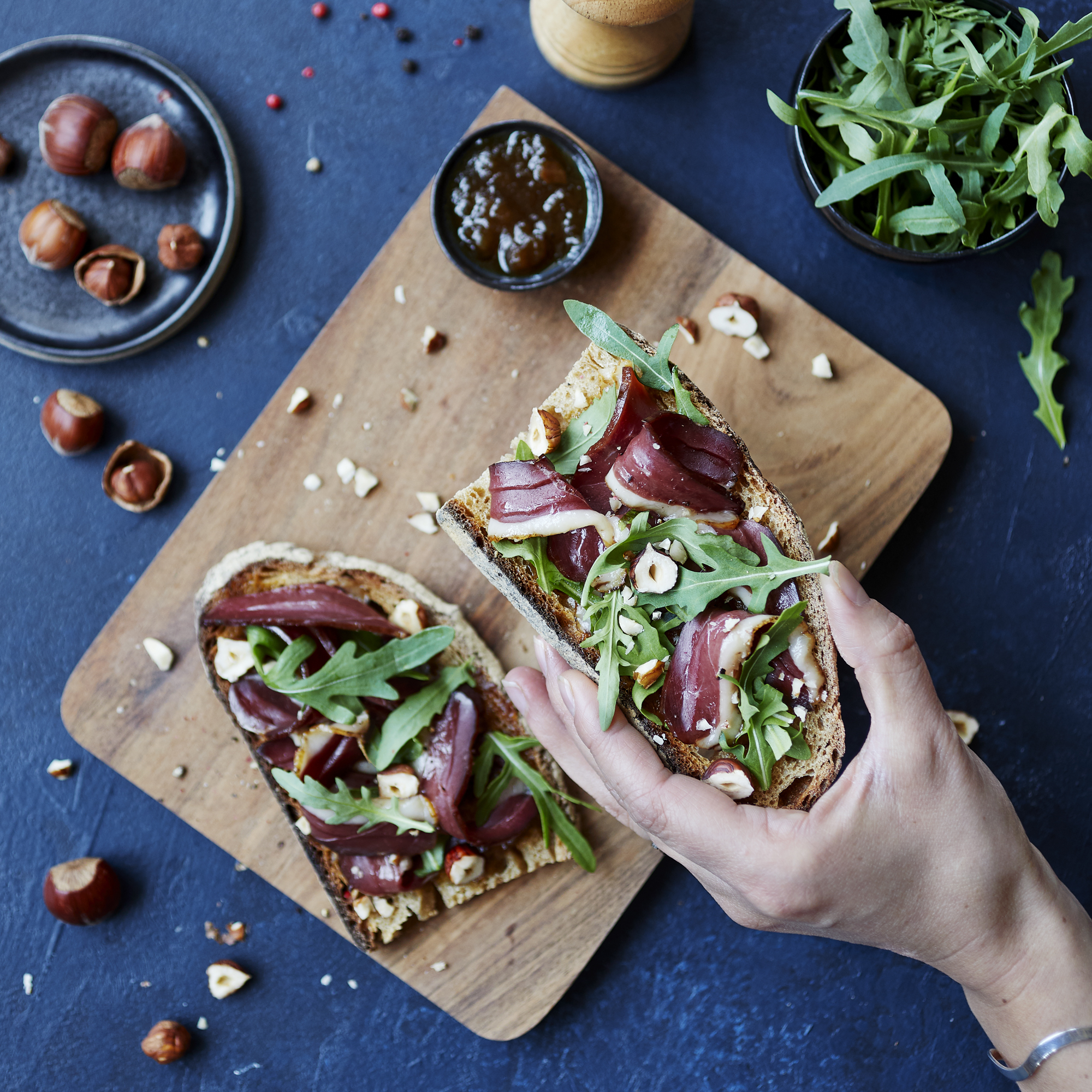 • 3.  Garnissez les tartines avec la roquette et les tranches de magret séché.
