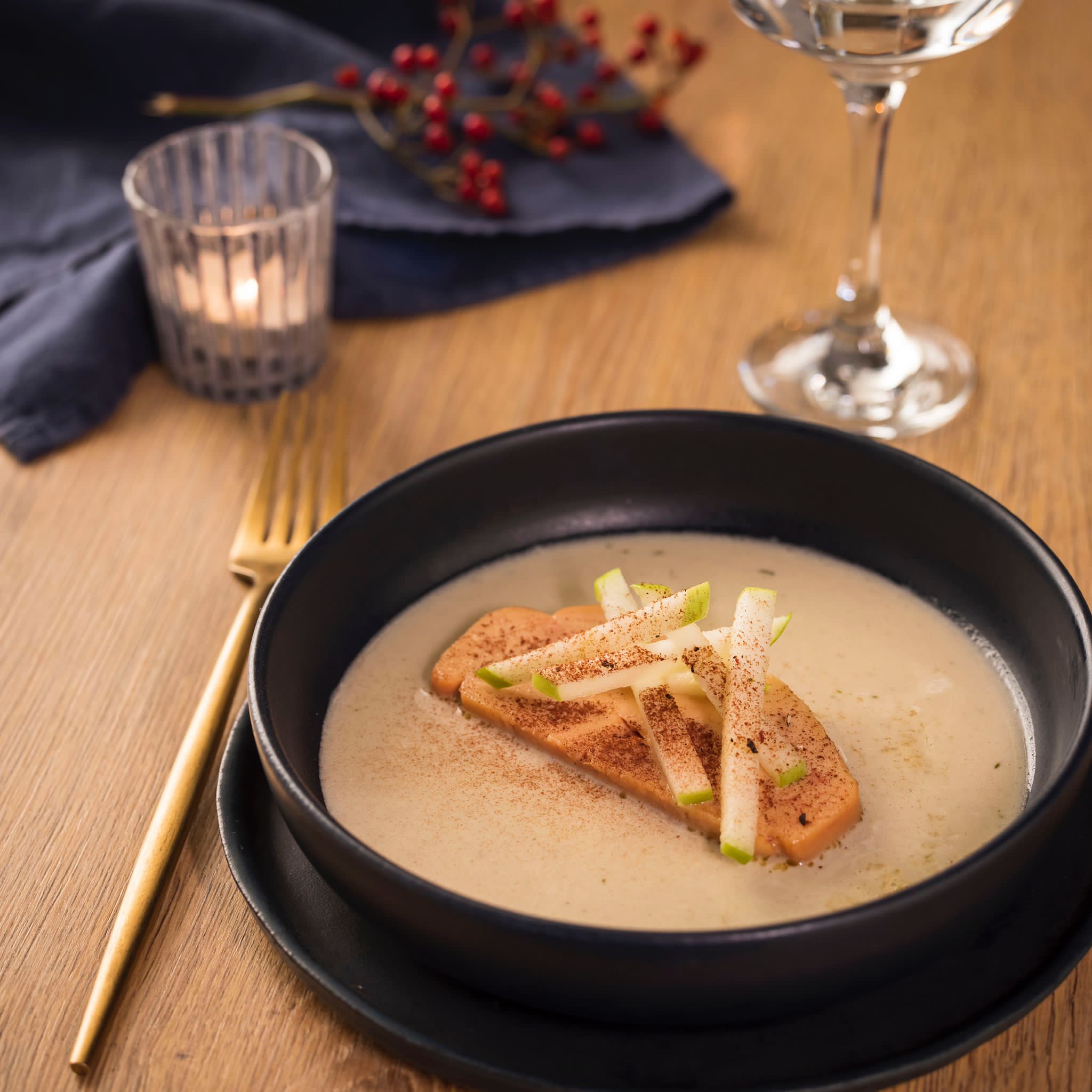 • 5.  Faites une julienne avec la pomme verte puis saupoudrez de cacao, dressez le tout harmonieusement dans une assiette creuse et servez le velouté bien chaud dessus.